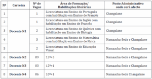 1. Por Despacho de 24 de Fevereiro de 2026, do Excelentíssimo Senhor Administrador do Distrito de Namaacha, torna-se publico o concurso para ingresso no Aparelho do Estado, para o provimento de nove (9) vagas na carreira de Docente N1, nove (9) na carreira de Docente N2, tres (3) na carreira de Docente N3 e seis (6) na carreira de Docente N4, existentes no Serviço Distrital de Educação, Juventude e Tecnologia de Namaacha, nos termos do nº 1 do artigo 34 do Estatuto Geral dos Funcionarios e Agentes do Estado, aprovado pela Lei nº 4/2022, de 11 de Fevereiro, conjugado com o artigo 3 do Decreto nº 36/2025, de 28 de Outubro e a Resolução nº 8/2002, de 22 de Maio, em observância ao preceituado no Diploma Ministerial nº 88/2005, de 28 de Abril, que aprova o regulamento de concurso para as carreiras regime especial da educação e o Diploma Ministerial nº 61/2000, de 5 de Julho, que aprova o regulamento de concursos nas carreiras de regime geral e especial da área comum do aparelho de Estado.